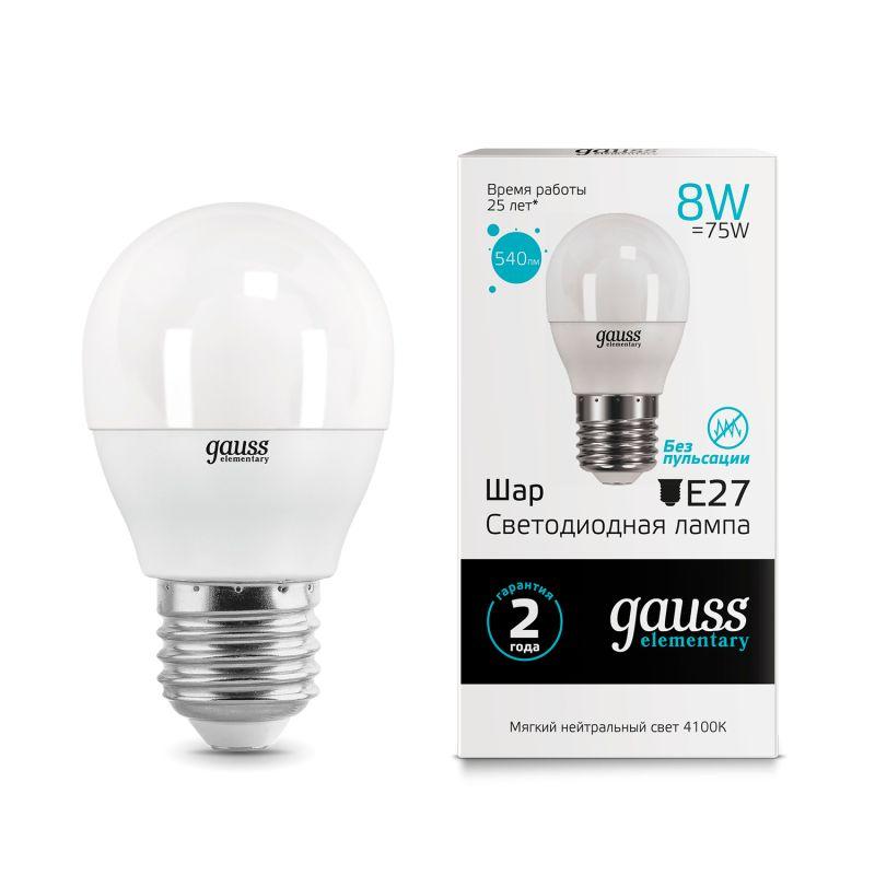 Характеристики Лампа светодиодная Elementary 8Вт P45 шар 4100К нейтр. бел. E27 540лм GAUSS 53228: