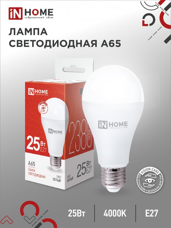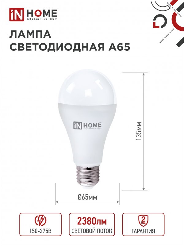 Назначение и применение Лампа светодиодная LED-A65-VC 25Вт 230В Е27 4000К 2380Лм IN HOME