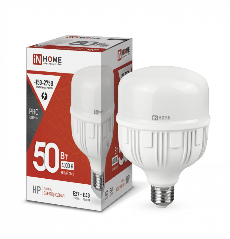 Назначение и применение Лампа светодиодная LED-HP-PRO 50Вт 230В Е27 с адаптером E40 4000К 4750Лм IN HOME