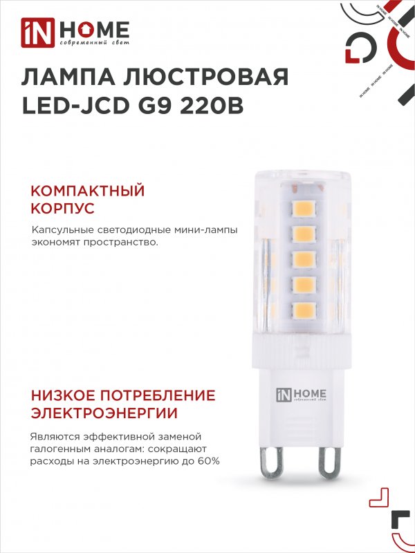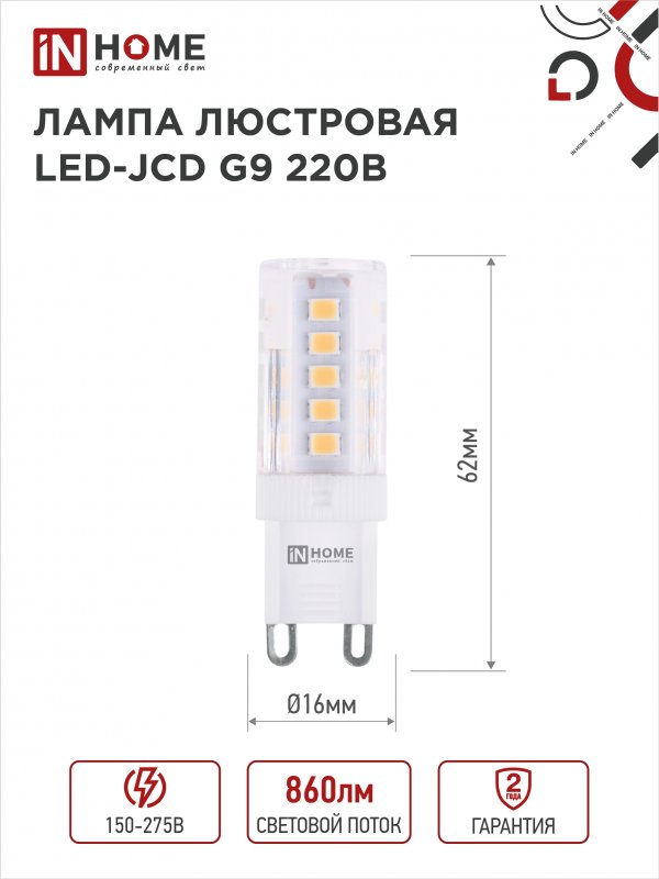 Характеристики Лампа светодиодная LED-JCD 230В 9Вт G9 6500К 860Лм IN HOME: