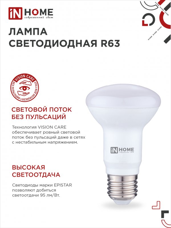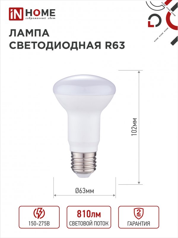 Назначение и применение Лампа светодиодная LED-R63-VC 9Вт 230В Е27 4000К 810Лм IN HOME