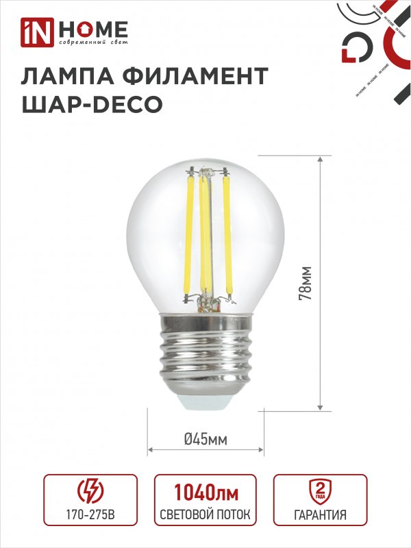 Характеристики Лампа светодиодная LED-ШАР-deco 9Вт 230В 230В Е27 3000К 1040Лм прозрачная IN HOME: