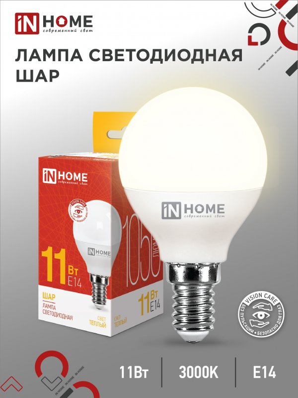 Характеристики Лампа светодиодная LED-ШАР-VC 11Вт 230В Е14 3000К 1050Лм IN HOME: