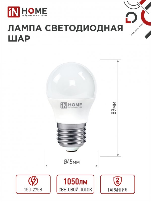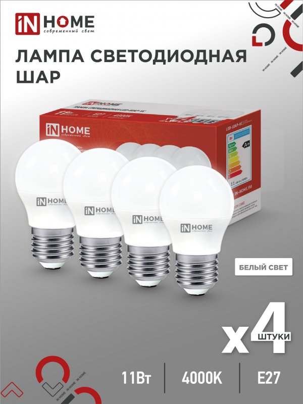 Характеристики Лампа светодиодная LED-ШАР-VC 4PACK 11Вт 230В Е27 4000К 1050Лм (4шт./упак) IN HOME: