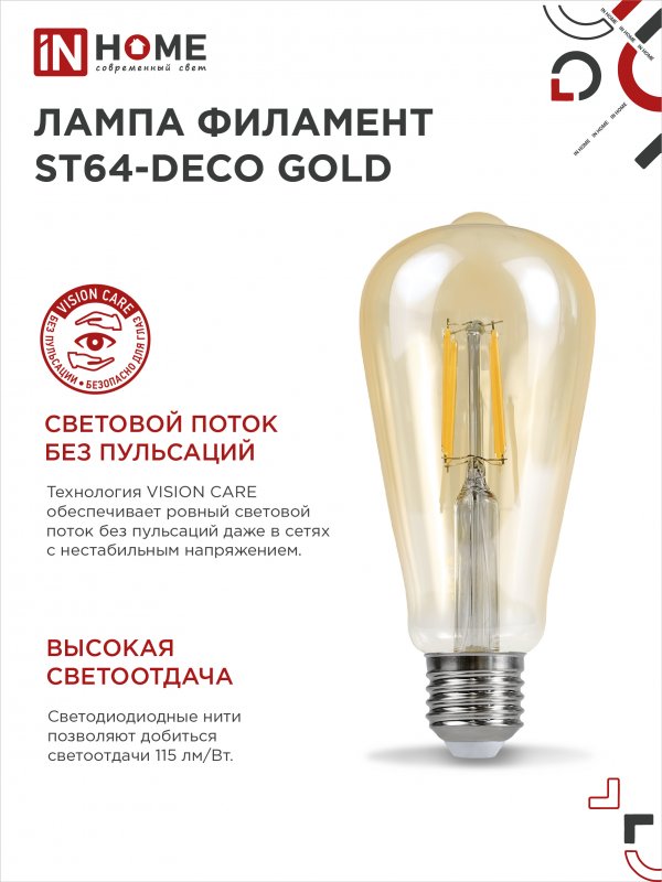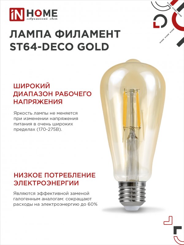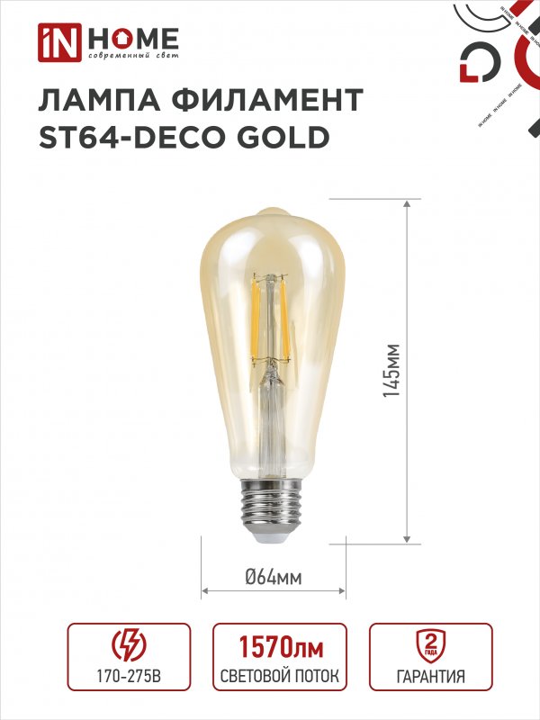 Характеристики Лампа светодиодная LED-ST64-deco gold 15Вт 230В Е27 3000К 1570Лм золотистая IN HOME: