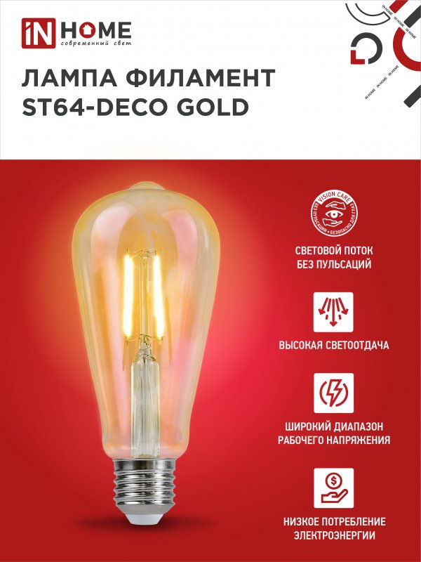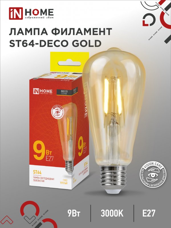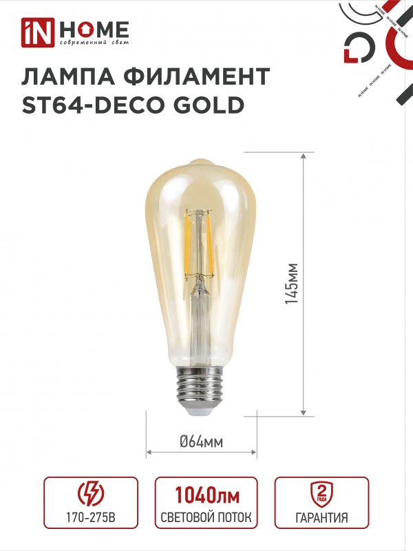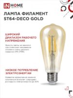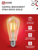 Характеристики Лампа светодиодная LED-ST64-deco gold 9Вт 230В Е27 3000К 1040Лм золотистая IN HOME: