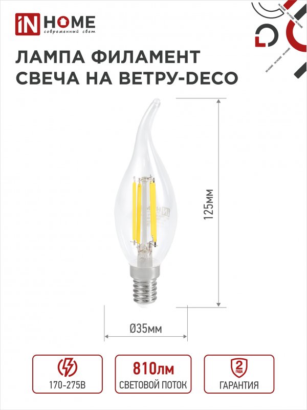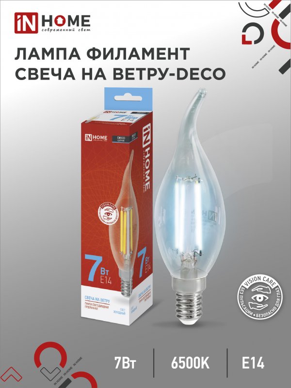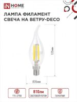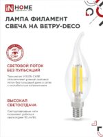 Характеристики Лампа светодиодная LED-СВЕЧА НА ВЕТРУ-deco 7Вт 230В Е14 6500К 810Лм прозрачная IN HOME: