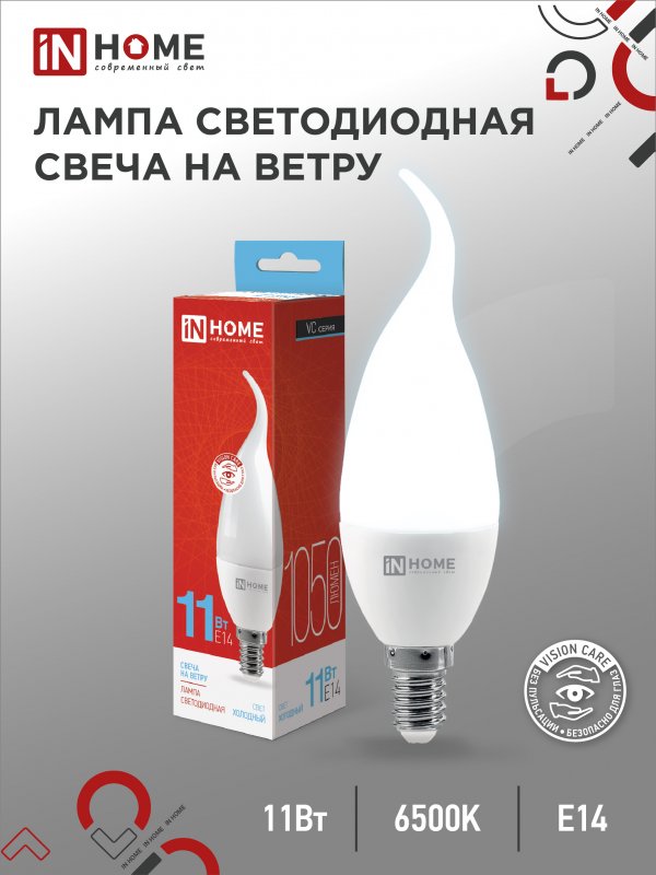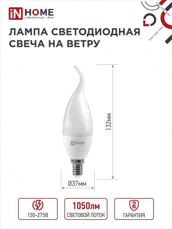 Характеристики Лампа светодиодная LED-СВЕЧА НА ВЕТРУ-VC 11Вт 230В Е14 6500К 1050Лм IN HOME: