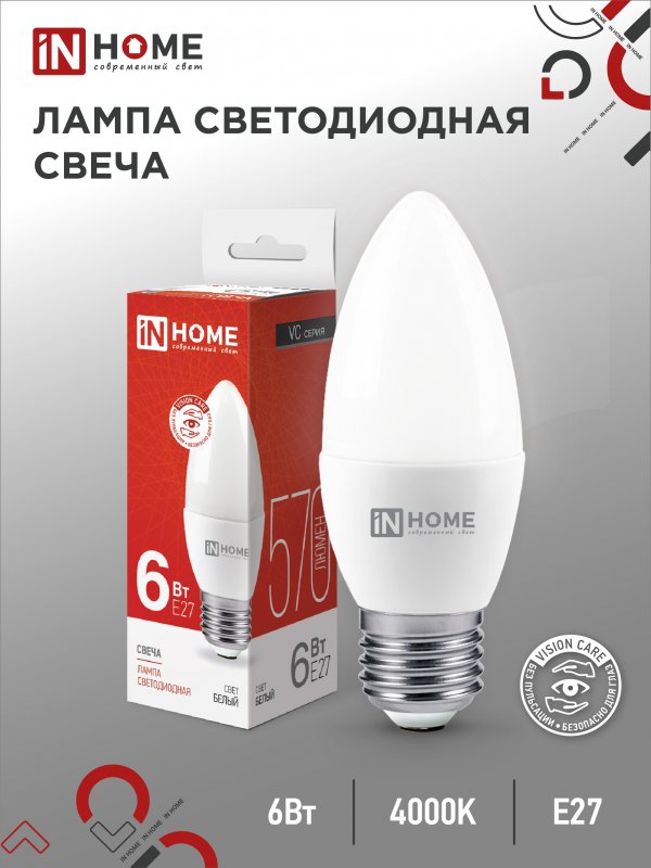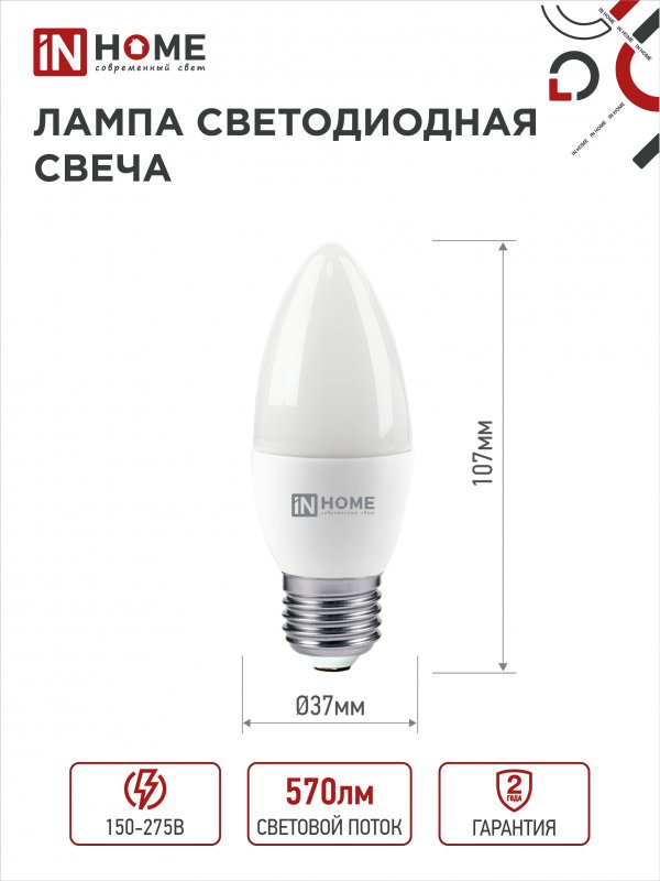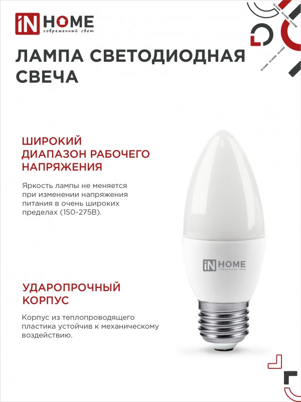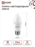 Характеристики Лампа светодиодная LED-СВЕЧА-VC 6Вт 230В Е27 4000К 570Лм IN HOME: