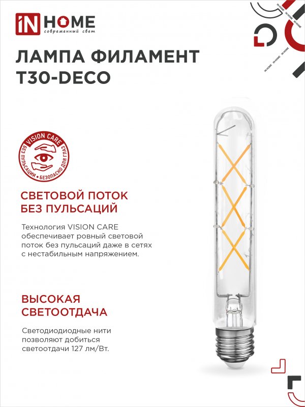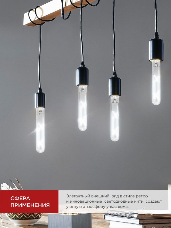 Светодиодная лампа филамент в форме цилиндра LED-T30-DECO не только обеспечит широкий угол освещения и экономичное энергопотребление, но и станет заметным элементом дизайна жилого помещения или общественного пространства