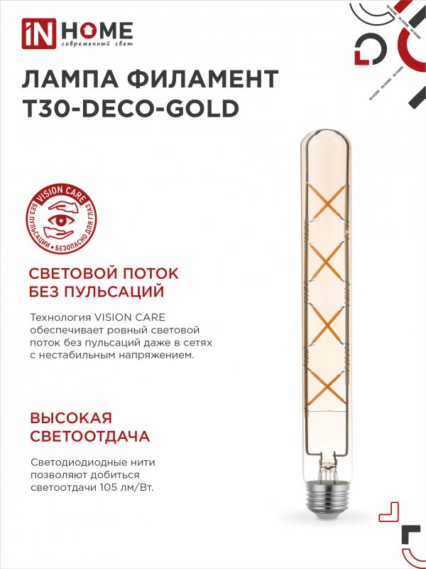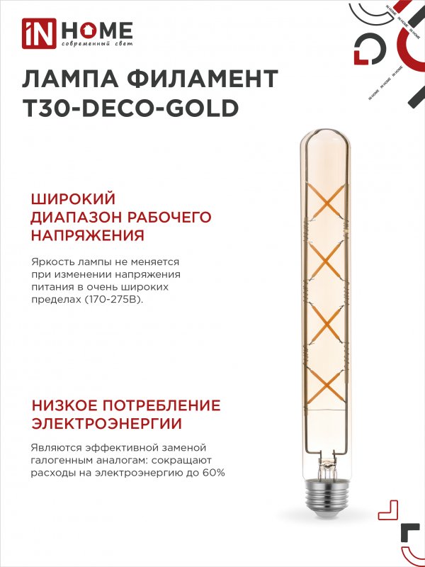 Характеристики Лампа светодиодная LED-T30-deco gold 11Вт 230В Е27 3000К 1160Лм 300мм золотистая IN HOME: