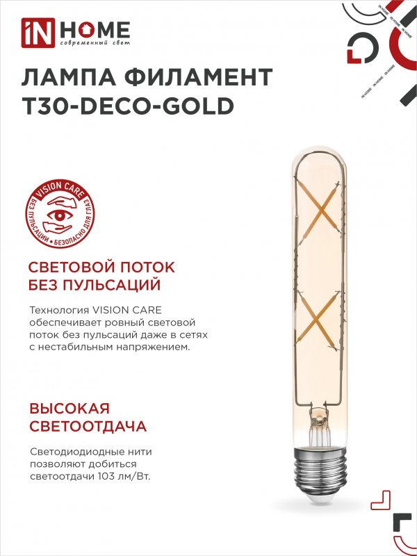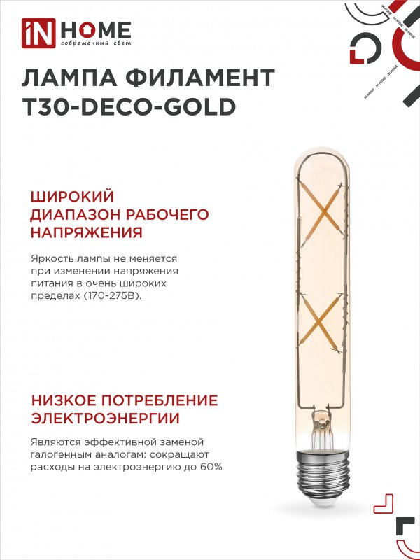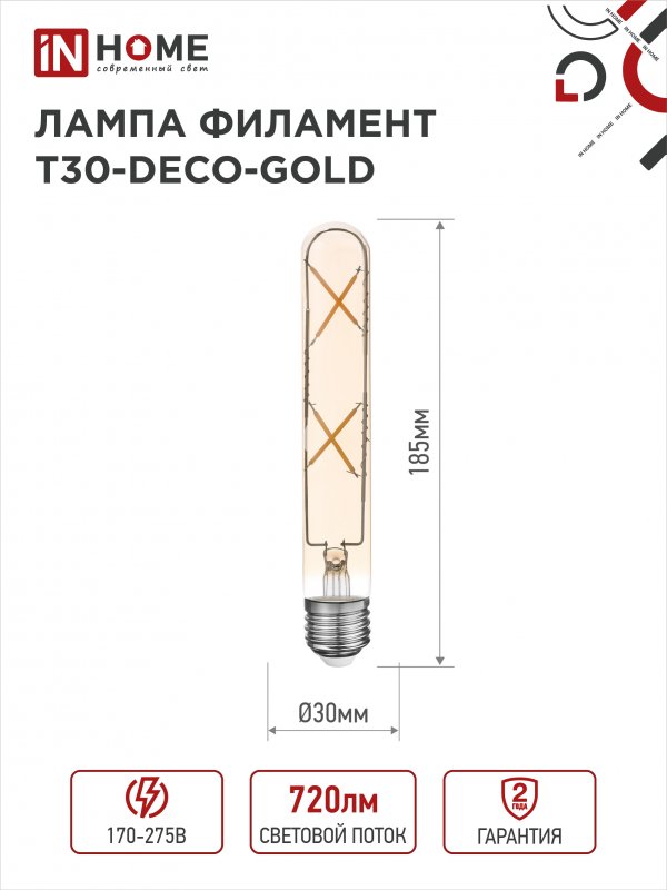 Характеристики Лампа светодиодная LED-T30-deco gold 7Вт 230В Е27 3000К 720Лм 185мм золотистая IN HOME: