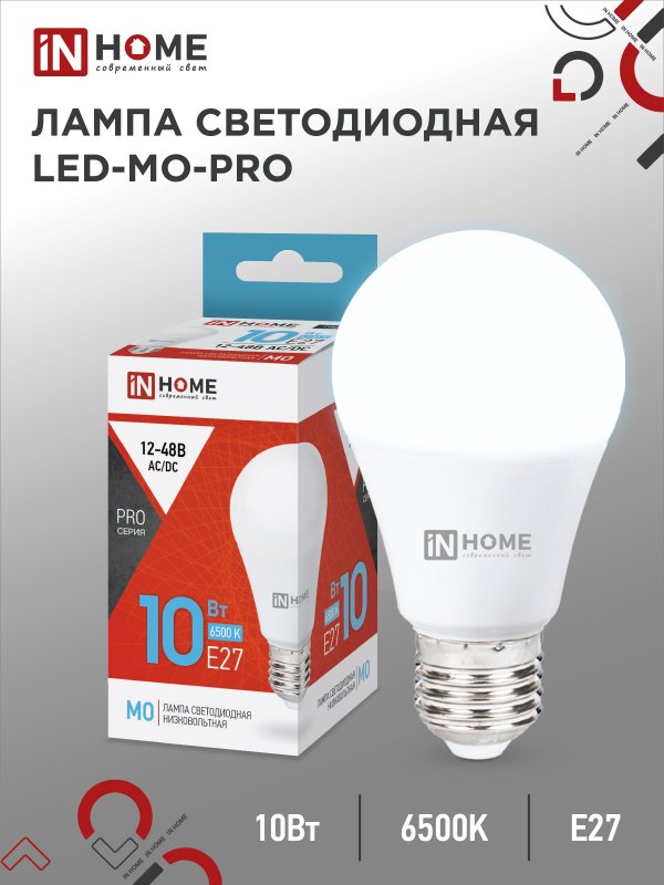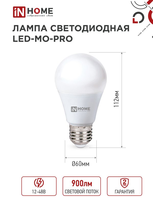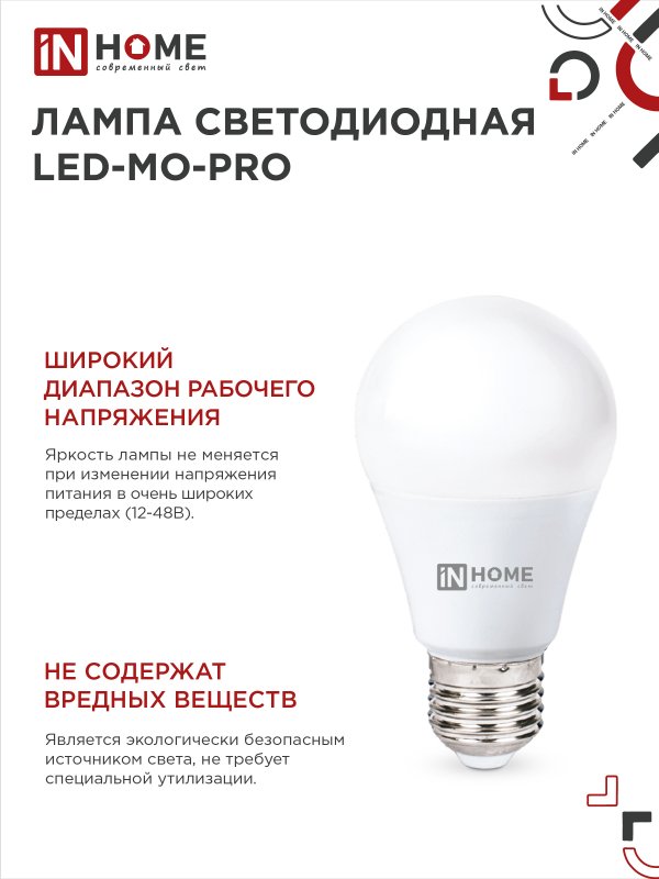 Назначение и применение Лампа светодиодная низковольтная LED-MO-PRO 10Вт 12-48В Е27 6500К 900Лм IN HOME