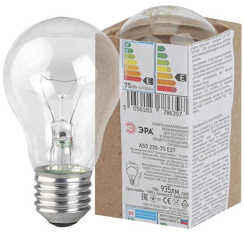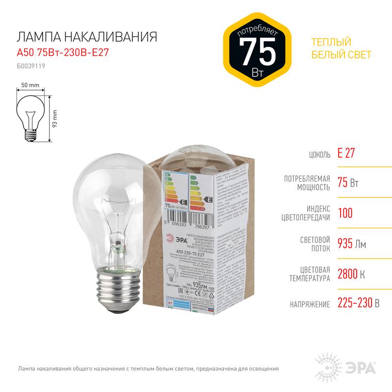 Характеристики Лампочка ЭРА A50 75Вт Е27 / E27 230В груша прозрачная в гофре: