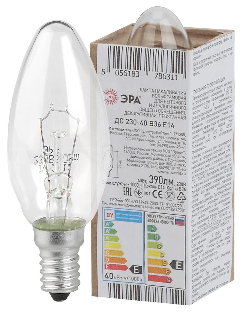 Характеристики Лампочка ЭРА B36 40Вт Е14 / E14 230В свечка прозрачная в гофре: