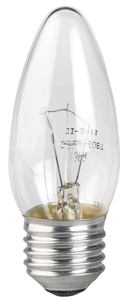Лампа накаливания вольфрамовая для бытового и аналогичного общего освещения. Лампа с колбой в виде свечи используется для декоративного оформления светильника, придания ему законченного и совершенного вида. Она красиво смотрится, создавая эффект настоящей зажженной свечи, что привносит в интерьер комнаты более уютный, успокаивающий и "теплый" вид. Прозрачная колба лампы создана специально для эффектов абсолютно чистого, искрящегося света.