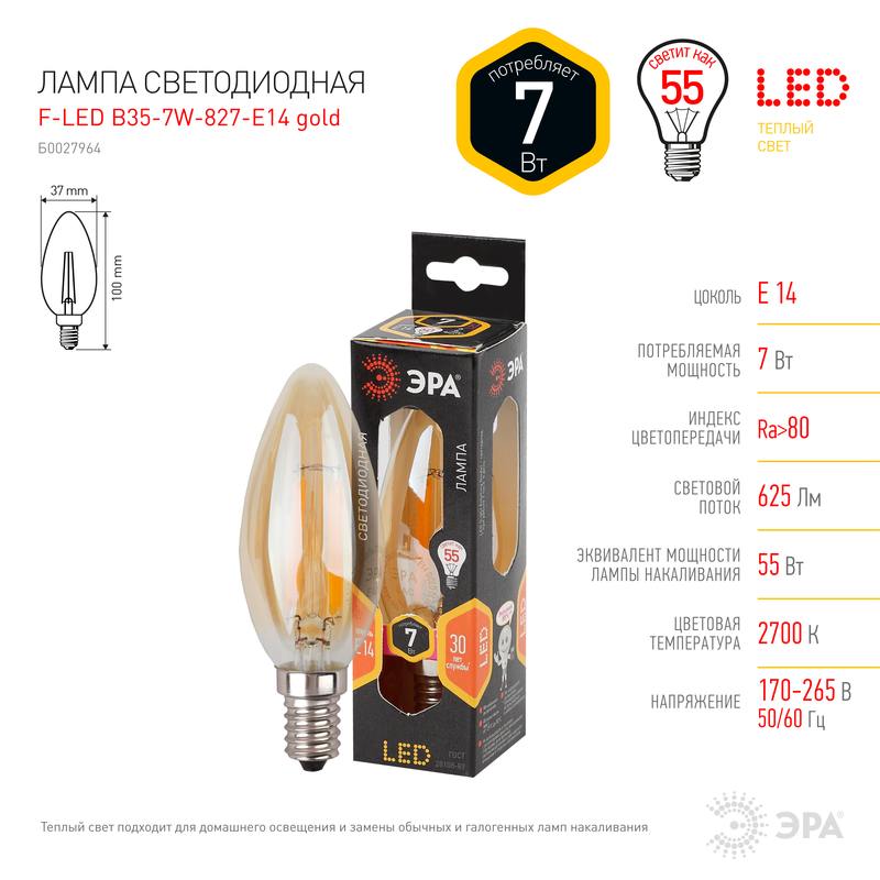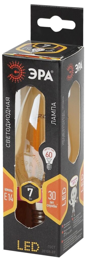 Характеристики Лампочка светодиодная ЭРА F-LED B35-7W-827-E14 gold Е14 / E14 7Вт филамент свеча золотистая теплый белый свет: