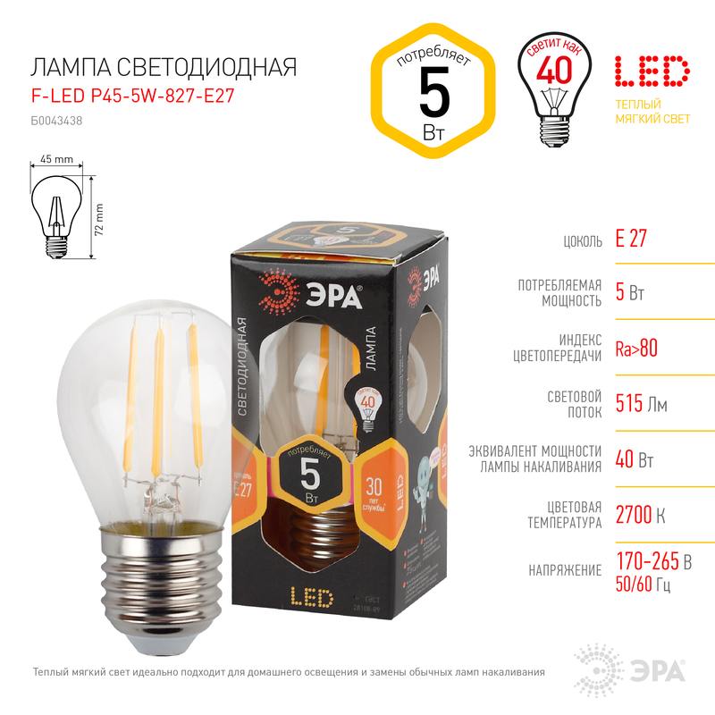Характеристики Лампочка светодиодная ЭРА F-LED P45-5W-827-E27 E27 / Е27 5Вт филамент шар теплый белый свет: