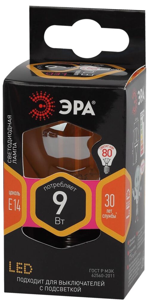 Характеристики Лампочка светодиодная ЭРА F-LED P45-9W-827-E14 gold E14 / Е14 9Вт филамент шар золотистый теплый белый свет: