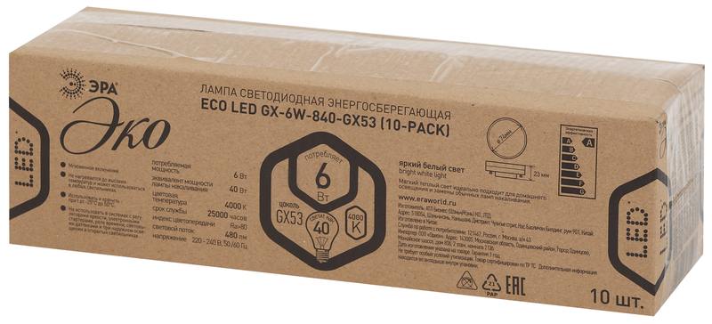 Характеристики Лампочка светодиодная ЭРА RED LINE ECO LED GX-6W-840-GX53 (10-PACK) GX53 6Вт таблетка нейтральный белый свет: