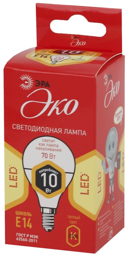 Бытовая светодиодная лампа ЭРА Серии Бюджет, создаёт яркое ровное освещение и экономит до 90% электроэнергии по сравнению с лампой накаливания с аналогичным световым потоком. Светит теплым светом с жёлтым оттенком — такая цветовая температура эффективна для отдыха и уютной атмосферы в доме. Используется в потолочных, настенных, настольных светильниках, в люстрах и бра. Мгновенно включается и не нагревается.