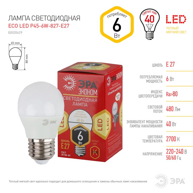 | Модель | ECO LED Р45-6W-827-E27 |