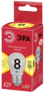 Характеристики Лампочка светодиодная ЭРА RED LINE ECO LED P45-8W-827-E2 E27 / Е27 8Вт шар теплый белый свет: