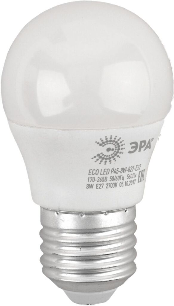Характеристики Лампочка светодиодная ЭРА RED LINE ECO LED P45-8W-827-E2 E27 / Е27 8Вт шар теплый белый свет: