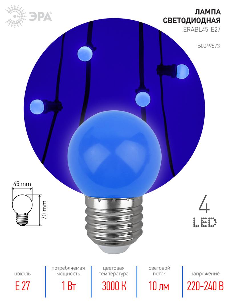 Характеристики Лампочка светодиодная ЭРА STD ERABL45-E27 E27 / E27 1Вт шар синий для белт-лайт: