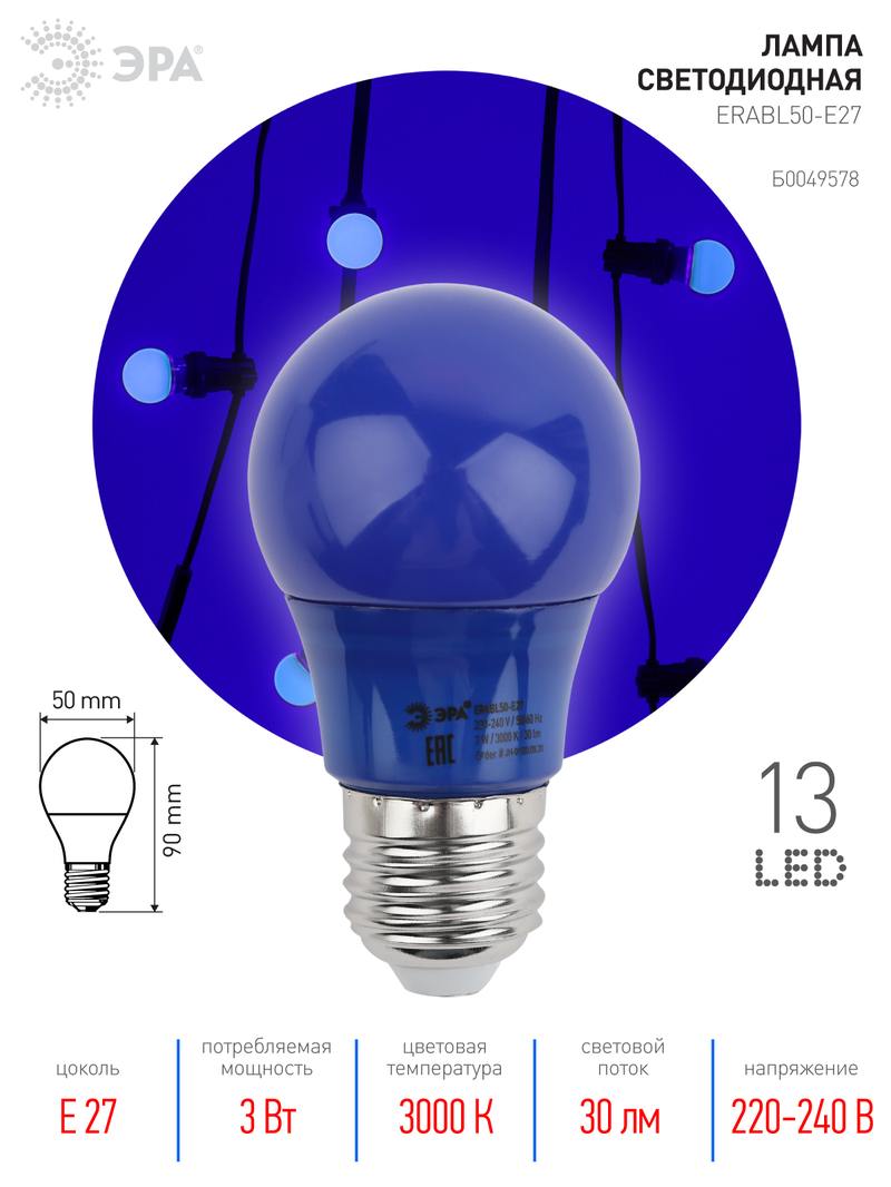 Характеристики Лампочка светодиодная ЭРА STD ERABL50-E27 E27 / Е27 3Вт груша синий для белт-лайт: