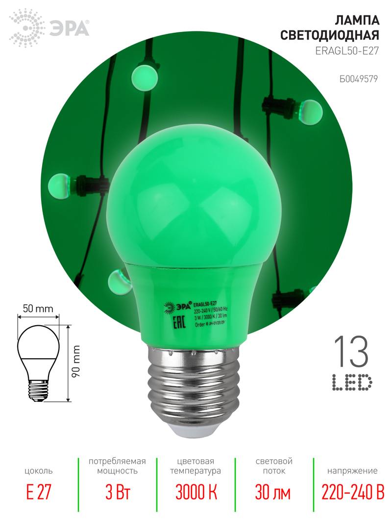 Характеристики Лампочка светодиодная ЭРА STD ERAGL50-E27 E27 / Е27 3Вт груша зеленый для белт-лайт:
