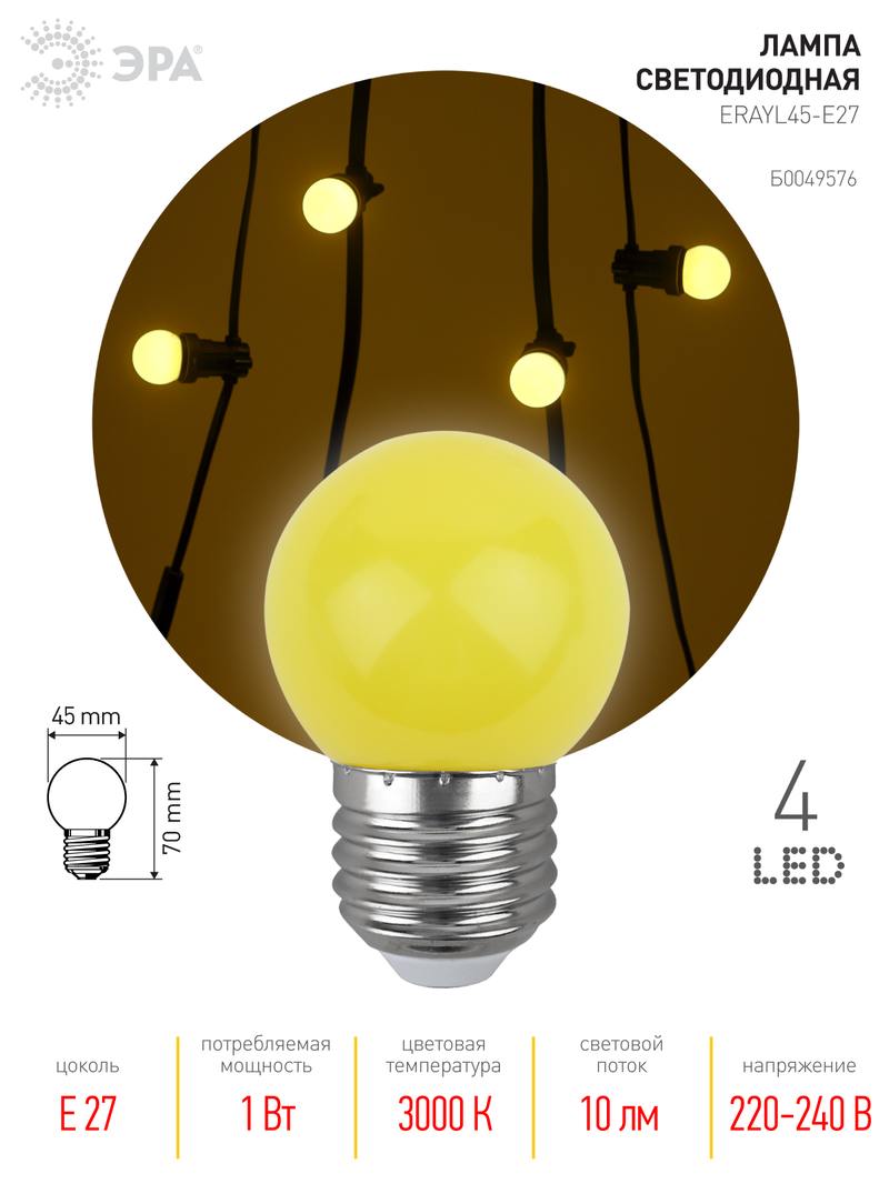 Характеристики Лампочка светодиодная ЭРА STD ERAYL45-E27 E27 / Е27 1Вт шар желтый для белт-лайт: