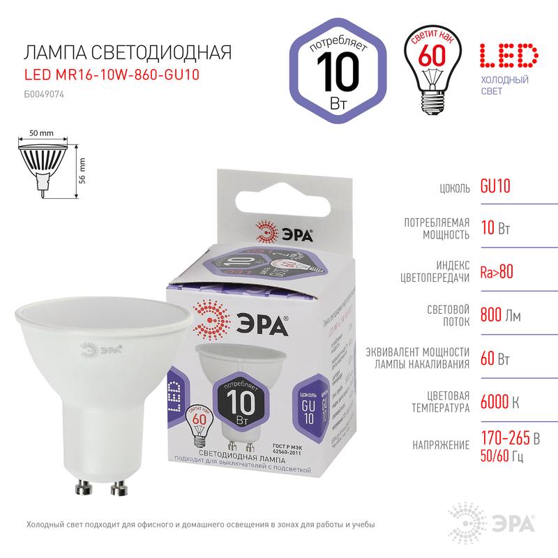 Характеристики Лампочка светодиодная ЭРА STD LED MR16-10W-860-GU10 GU10 10Вт софит холодный дневной свет: