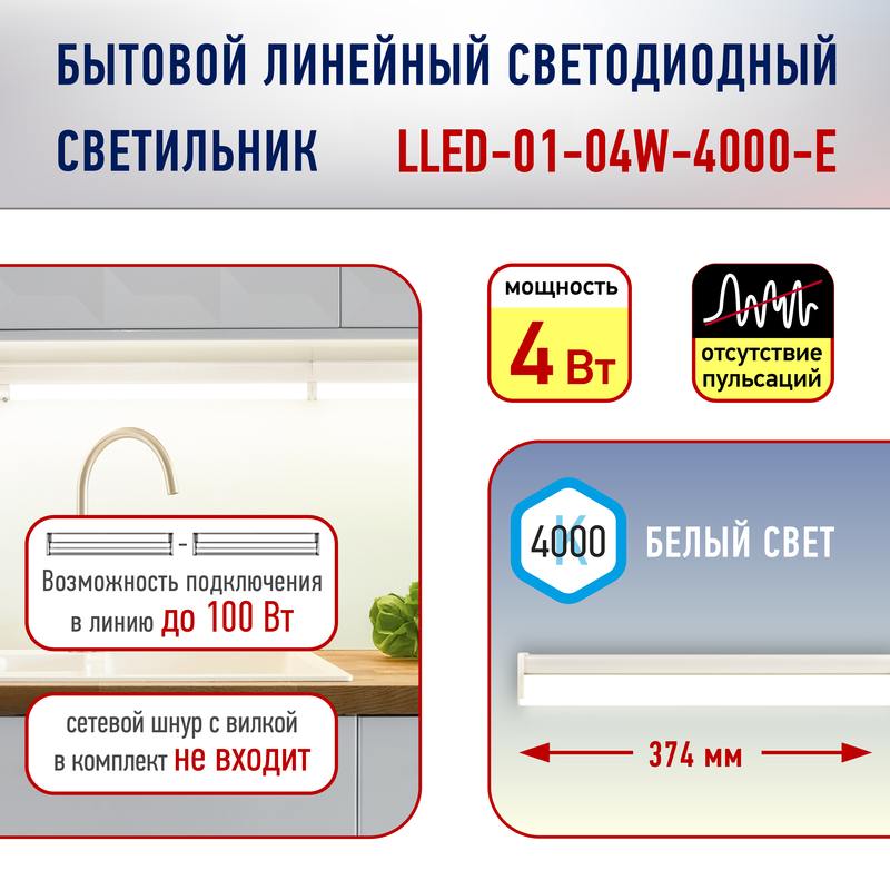 Характеристики Линейный светодиодный светильник ЭРА LLED-01-04W-4000-E 4Вт 4000К 380Лм L314мм: