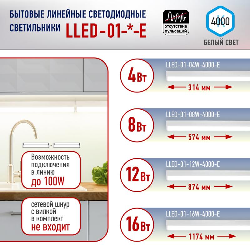 Линейный светодиодный светильник LLED-01 мощностью 12W 230V. В комплекте: светильник без выключателя, сетевой шнур 15см без вилки, твердый коннектор, крепеж для монтажа на вертикальную или горизонтальную поверхность. Максимально допустимая мощность подключения в линию: 100 Вт.
