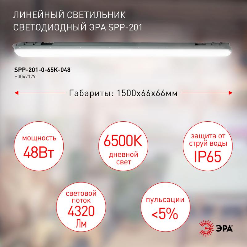 Линейные светильники ЭРА SPP-201 абсолютно универсальны и успешно применяются для освещения как производственных помещений, так и пространств бытового сектора. За счёт своих высоких светотехнических характеристик они создают яркий качественный свет в цехах, складах, паркингах, гаражах, подвалах, подсобках. Хорошая защита от влаги и пыли (IP65) позволяет эффективно использовать данные осветительные приборы в помещениях с повышенной влажностью и высоким содержанием в воздухе мелких частиц. Удлинённая конструкция корпуса равномерно распределяет свет в больших по площади помещениях как с низкими, так и с высокими потолками. Экономичная светодиодная технология сокращает расходы на электроэнергию до 80%. Помимо крепкого корпуса, светильники ЭРА SPP-201 имеют ударопрочный плафон из поликарбоната IK08. Провод вводится через гермоввод — удобно: для обеспечения герметичности подключения не требуется распаячная коробка. Упрощён и монтаж: отсек для подключения без винтов, разбирать корпус не нужно. Коэффициент пульсации ЭРА SPP-201 менее 5%, что является хорошей характеристикой для освещения нежилых помещений. ЭРА предлагает линейные светильники SPP-201 нейтральной белой (4000К) и холодной белой (6500К) цветовой температуры. Коэффициент мощности PF > 0,95. Диапазон рабочих напряжений: 170 — 260 В. Гарантия — 3 года. Габаритная яркость: &8804; 5000 кд/м2. Класс светораспределения: П. Класс по ограничению яркости: 3.