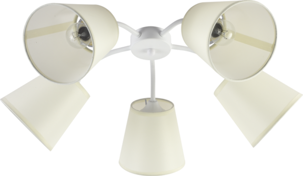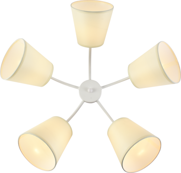 5-рожковая белая люстра с тканевыми плафонами в виде абажуров, направленных в разные стороны — Rivoli Aimee (арт. 9162-305). Коллекция Aimee итальянского бренда Rivoli – это белые лаконичные люстры классического дизайна. К заказу доступна также люстра с 3 плафонами – арт. 9162-303. Источники света, подходящие к данным люстрам потолочным – Е27 60 Вт.
