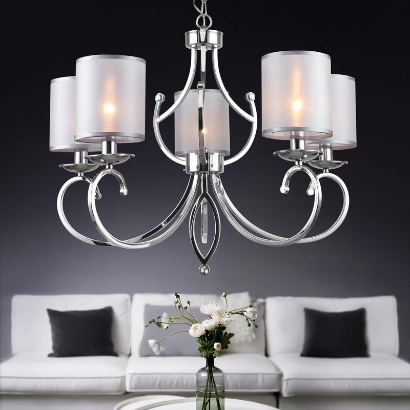 Люстра с 5 плафонами (арт. 2063-305), люстра с 8 плафонами (арт. 2063-308) и бра (арт. 2063-401) составляют коллекцию Rivoli Amy в классическом стиле. Дизайнерские подвесные люстры Amy от итальянского бренда Rivoli окрашены в трендовый цвет хром гальваническим способом, сохраняющим насыщенность оттенка на долгие годы и защищающим люстры от царапин и сколов. Подвес люстры декорирован цепочкой, при монтаже люстры на потолок длину подвеса можно отрегулировать. Светлые полупрозрачные плафоны из ткани великолепно пропускают свет, делая освещение в комнате мягким и комфортным для глаз. Освещаемая площадь данной люстры – 15 м2. Рожки с плавными завитками и аккуратный декоративный бутон по центру грамотно создают эстетичный облик классической люстры.
