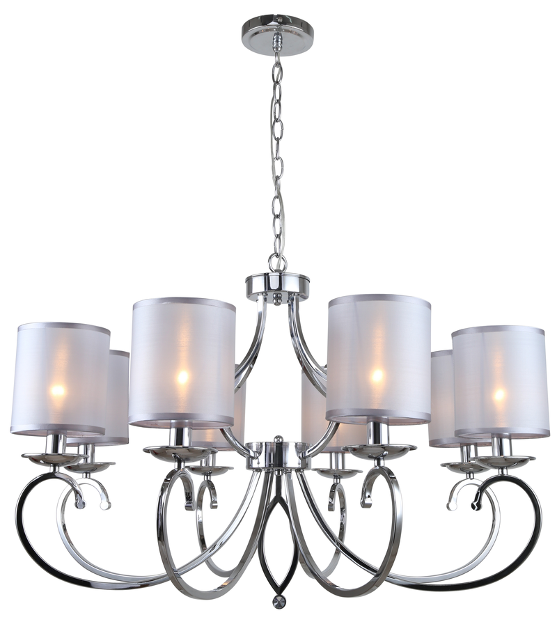 Люстра классическая Rivoli Amy (арт. 2063-308) с полупрозрачными тканевыми плафонами под 8 ламп Е14 40 Вт. Данные люстры подвесные входят в классическую коллекцию Amy итальянского бренда Rivoli вместе с бра (арт. 2063-401) и люстрой под 5 ламп (арт. 2063-305). «Фишки» коллекции – плавные линии, закругляющиеся рожки, которые держат плафоны на манер канделябров, декоративная хромированная розетка по центру люстры, аккуратная цепочка подвеса, цилиндрические плафоны из светлой ткани. Лампочки для люстр и бра Rivoli Amy – Е14 мощностью 40 Вт (приобретаются отдельно, можно купить экономичные светодиодные лампы).