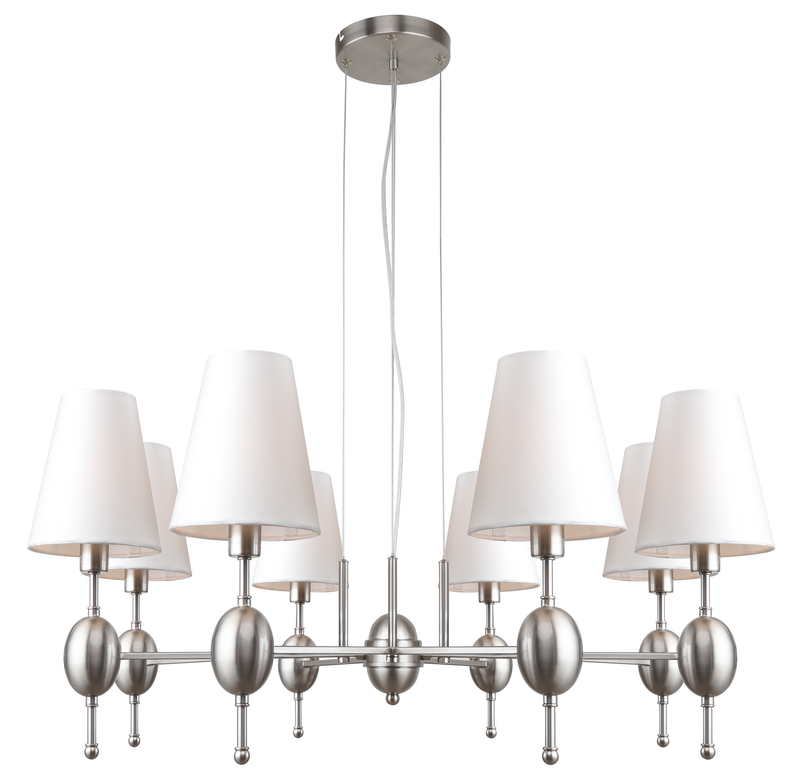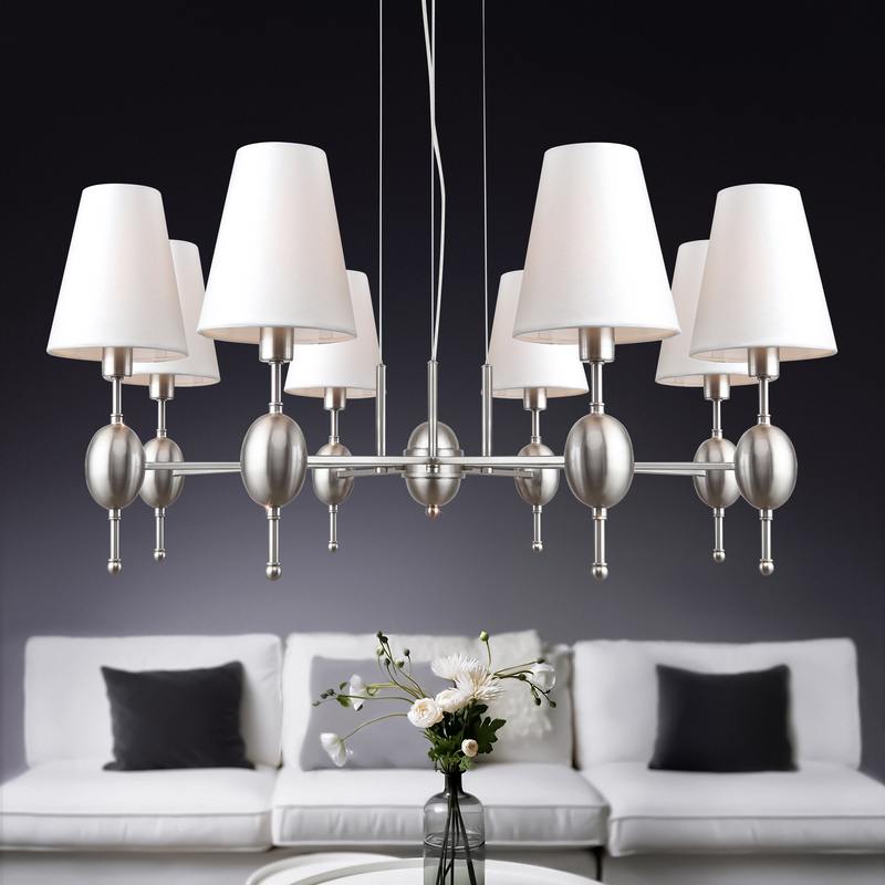 Подвесная люстра с регулировкой высоты – Rivoli Annabelle в цвете корпуса никель сатин. Данная модель (арт. 2064-308) с 8 плафонами из прочной пыленепроницаемой ткани дополняет коллекцию Annabelle итальянского бренда Rivoli, куда входят также люстры подвесные с 6 плафонами (арт. 2064-306) и бра (арт. 2064-401). Стиль современная классика находится на пике популярности. Люстры дизайнерские Annabelle Rivoli помогут создать актуальное пространство, сочетающее в себе уютную атмосферу и трендовые детали.