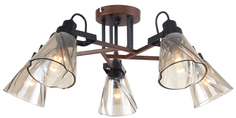 Люстра потолочная Rivoli Clarissa (арт. 5098-305) полностью соответствует популярному стилю лофт-кантри. В числе дизайнерских решений, применённых для данной люстры: рожки с металлическими скобами, декоративно выпущенный провод, сочетание металла и тёмного дерева в окрашивании корпуса люстры, тонировка стекла. Люстра на коротких металлических штангах эффектно выглядит на потолке, идеально подходит для невысоких потолков и потолков средней высоты. Освещаемая площадь данной люстры с 5 стеклянными тонированными плафонами – до 15 м2.