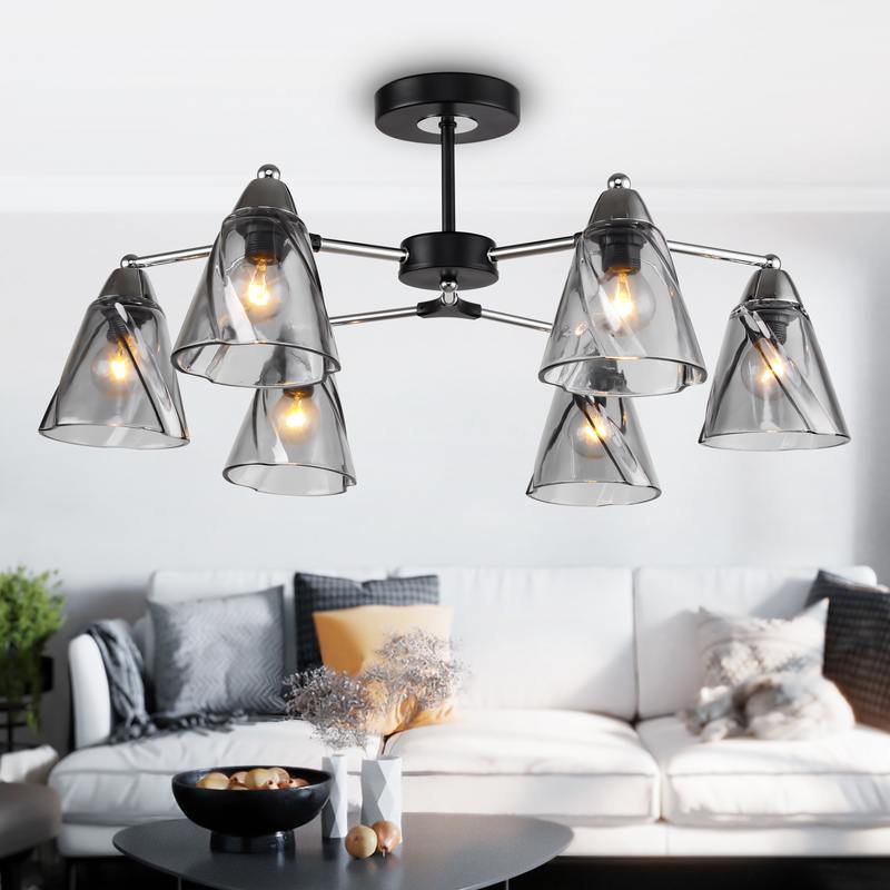 Металлическая потолочная люстра на штанге, выполненная в стиле модерн, станет удачным решением для преображения современной квартиры, дома, общественного пространства. Потолочная люстра с 6 стеклянными плафонами с лёгким затемнением осветит площадь до 18 м2. При этом свет люстры не будет слишком ярким для глаз. Плафоны люстры изготовлены из стекла и радуют аккуратным выдувным декором. Черный корпус люстры дополнен элементами цвета хром.