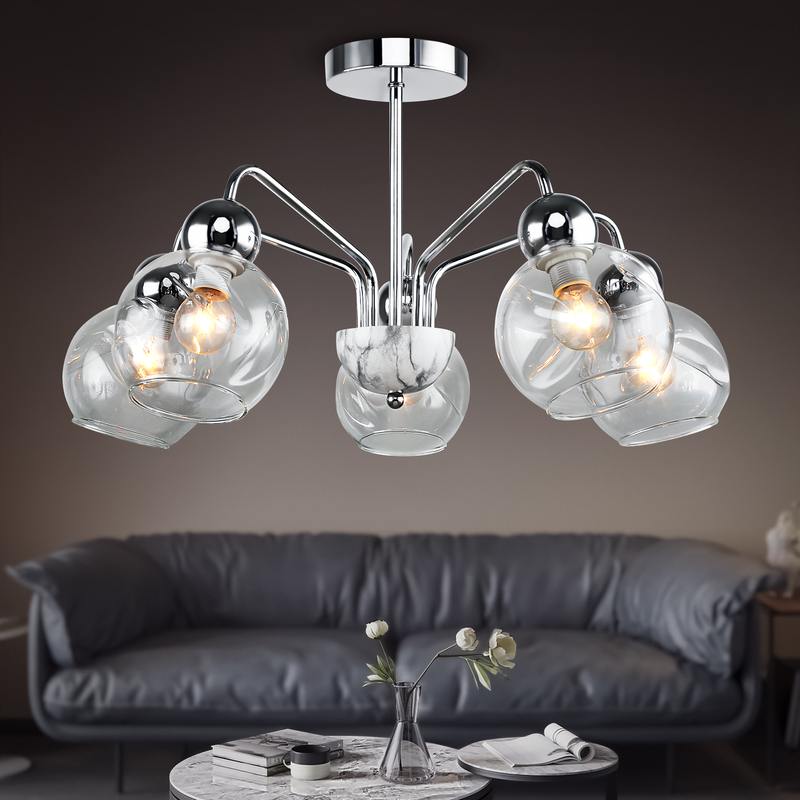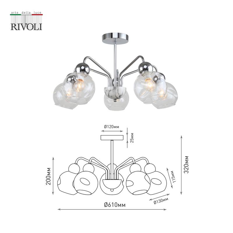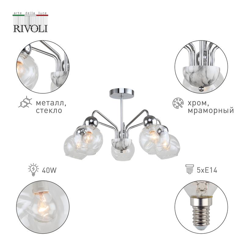 Металлическая люстра потолочная Rivoli Dena (арт. 3147-305) цвета хром с эффектным декоративным элементом под мрамор. Прочная люстра из металла на штанге прослужит долго. 5 стеклянных плафонов люстры создают яркое широкое освещение на площади до 15 м2. Минималистичные хромированные рожки люстры отлично смотрятся в современных интерьерах. Купить потолочные люстры на штанге стоит в пространства стилей модерн, минимализм, классика, современная классика, кантри. Если нужна люстра с большим количеством плафонов, рассмотрите модель Rivoli Dena под 7 ламп – арт. 3147-307. Если ищете настенные светильники, в комплект к люстрам есть бра Rivoli Dena – арт. 3147-401.
