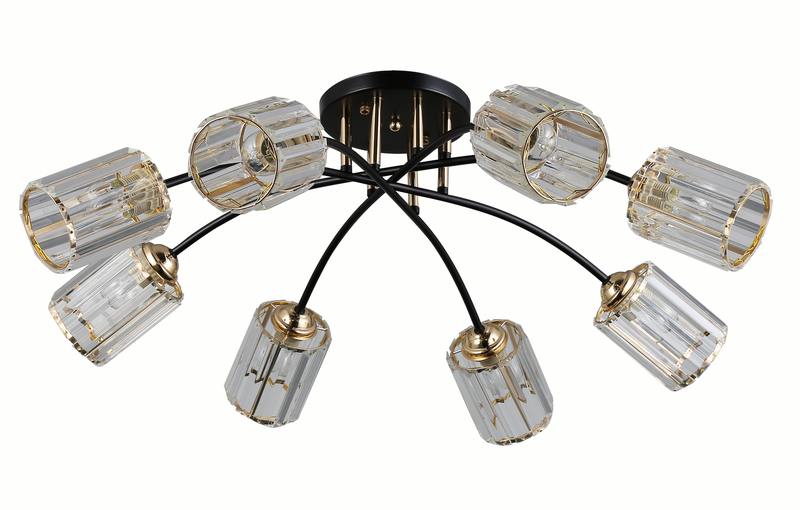Rivoli Emanuelle (арт. 9101-308) — 8-рожковые люстры с фигурными стеклянными плафонами, имеющими геометричное рифление. Арматура этих современных люстр примечательна своим комбинированным окрашиванием в цвета черный и золото. Прозрачные плафоны декорированы золотистыми элементами.