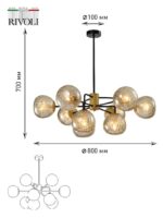 Нежная и жизнерадостная серия с фигурными литыми плафонами и деталями цвета античного золота всё, как и положено богине юности. Древние Греки знали толк в красоте и полноте жизни: округлые плафоны люстр Rivoli Geba в форме плодов фундука имеют рельефные углубления, в которых задорно играют световые лучи. Коллекция прредставлена 9-ти рожковой люстрой.
