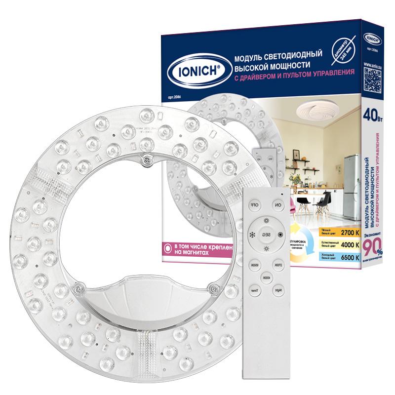 Характеристики Модуль светодиодный высокой мощности с пультом ДУ для декоративных светильников 40Вт 230В 3000-6500К d245мм диммир. IP20 IONICH 2086: