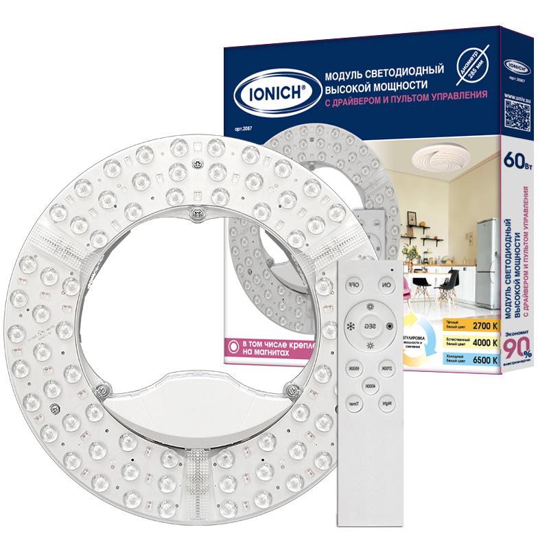 Характеристики Модуль светодиодный высокой мощности с пультом ДУ для декоративных светильников 60Вт 230В 3000-6500К d285мм диммир. IP20 IONICH 2087: