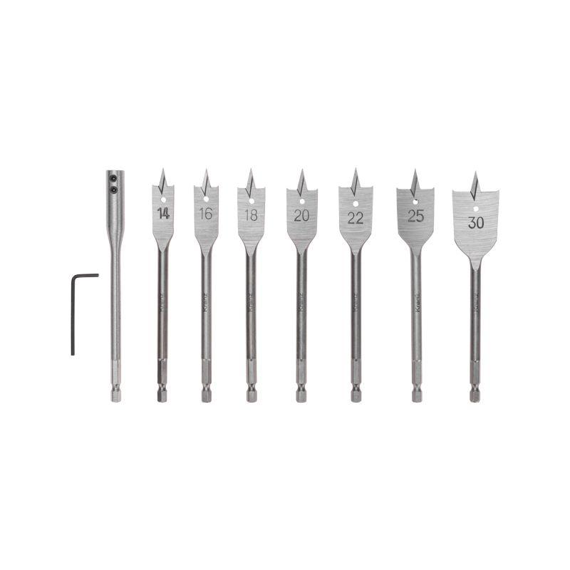 Характеристики Набор сверл перовых по дереву 9 предметов: 14-16-18-20-22-25-30х152мм удлинитель ключ угловой Kranz KR-91-0762: