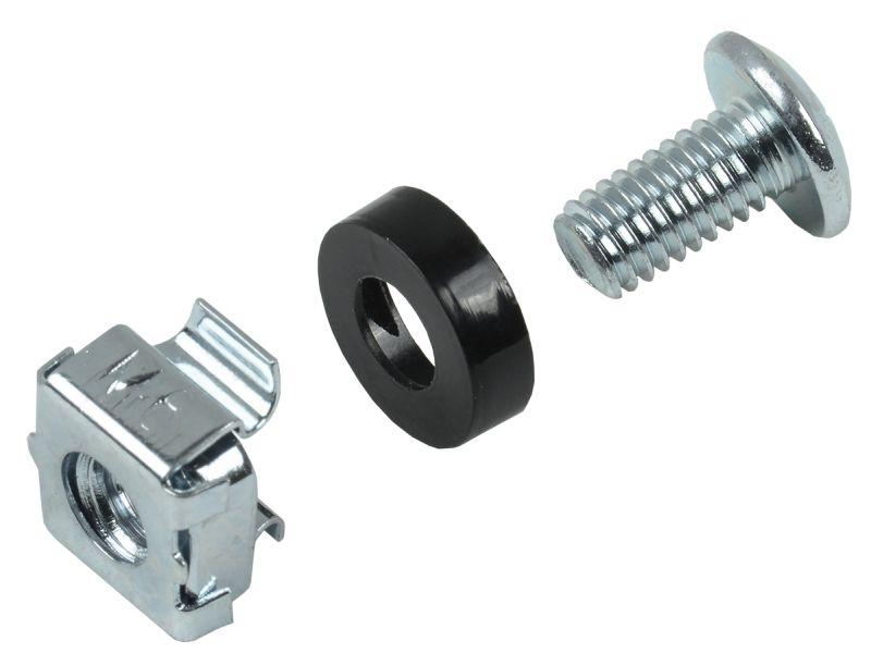 Набор винт-шайба-гайка необходим для крепления оборудования на монтажные профили шкафов и стоек. Гайки в наборе имеют квадратную форму и специальные «лапки», прочно фиксирующие их в квадратном отверстии монтажных профилей, что облегчает установку оборудования, т.к. нет необходимости держать гайку руками. Также в наборе предусмотрены пластиковые шайбы, предотвращающие повреждение оборудования при затягивании винтов в гайку.