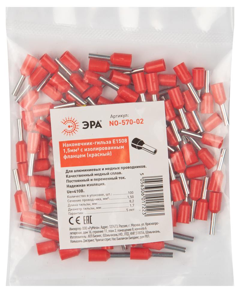 Характеристики Наконечник-гильза НШВИ ЭРА NO-570-02 Е1508 1,5мм2 с изолированным фланцем красный упаковка 100 шт: